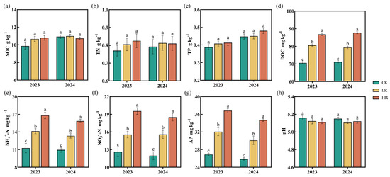 Effect of RAE on the SOC (a), TN (b), TP (c), DOC (d), NH4+-N (e), NO3—N (f), AP (g), and pH (h) of the maize soil in 2023 and 2024. CK, control; LR, low RAE dosage (150 L/ha); HR, high RAE dosage (300 L/ha). SOC, soil organic carbon; TN, total nitrogen; TP, total phosphorus; DOC, dissolved organic carbon; NH4+-N, ammonium nitrogen; NO3−-N, nitrate nitrogen; AP, available phosphorus. Different letters indicate statistically significant differences (n = 4, p < 0.05).