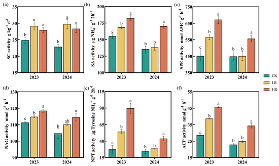 Effect of RAE on the SC (a), SA (b), SPE (c), NAG (d), NPT (e), and ACP (f) activities of the maize soil in 2023–2024. CK, control; LR, low RAE dosage (150 L/ha); HR, high RAE dosage (300 L/ha). SC, soil sucrase; SA, soil amidase; SPE, soil peptidase; NAG, soil 1,4-β-N-acetylglucosaminidase; NPT, soil protease; ACP, soil acid phosphatase. Different letters indicate statistically significant differences (n = 4, p < 0.05).