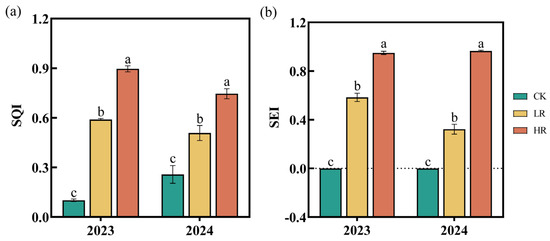 In 2023 and 2024, the SQI values for the CK, LR, and HR ranged from 0.10 to 0.26, 0.51 to 0.59, and 0.75 to 0.90, respectively (Figure 4a). The SEI value for the CK remained at 0 in both years, while the LR and HR showed SEI values of 0.32–0.58 and 0.95–0.96, respectively (Figure 4b). The application of RAE (LR and HR) significantly improved both SQI and SEI, with the HR demonstrating the most pronounced effects.