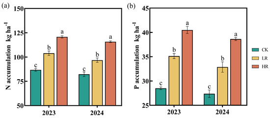 Effect of RAE on the N accumulation (a) and P accumulation (b) of the maize plant in 2023–2024. CK, control; LR, low RAE dosage (150 L/ha); HR, high RAE dosage (300 L/ha). Different letters indicate statistically significant differences (n = 4, p < 0.05).