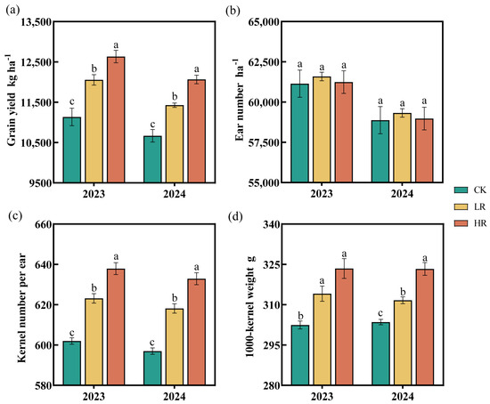The effects of RAE application (LR and HR) on the maize yield components varied (Figure 6). The RAE significantly increased grain yield, kernel number per ear, and 1000-kernel weight but had no significant impact on the ear number. Compared to the CK, the LR significantly increased grain yield by 7.12–8.26%, kernel number per ear by 3.51–3.54%, and 1000-kernel weight by 2.67–3.85% across both the 2023 and 2024 growing seasons. The HR demonstrated even more pronounced effects, yielding greater improvements of 13.09–13.46% in grain yield, 5.96–6.01% in kernel number per ear, and 6.52–6.94% in 1000-kernel weight.
