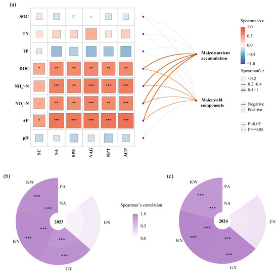 Correlation analysis by Mantel’s test (a); correlation analysis of maize yield components with plant N and P accumulation in 2023 (b) and 2024 (c). Note, RAE, RAE addition; SOC, organic carbon; TN, total nitrogen; TP, total phosphorus; DOC, dissolved organic carbon; NH4+-N, ammonium nitrogen; NO3−-N, nitrate nitrogen; AP, available phosphorus; GY, grain yield; EN, ear number; KN, kernel number per ear; KW, 1000-kernel weight; NA, maize N accumulation; PA, maize P accumulation. Correlation analysis and Mantel’s test were performed by Spearman’s method. ***, p < 0.001; **, p < 0.01; *, p < 0.05.