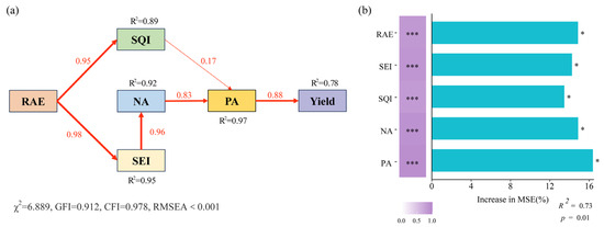 Relationships of maize yield with nutrient cycle. Structural Equation Modeling (SEM) was used to identify the nutrient cycle that affected maize yield (a). Red arrows illustrate positive correlations (p < 0.05). The numbers on the arrows correspond to significant standardized path coefficients, and R² indicates the variance of the dependent variable explained by the model. Random forest was used to analyze the importance of impact factors of maize yield (b). Note, RAE, RAE addition; SQI, soil quality index; SEI, soil enzyme index; NA, maize N accumulation; PA, maize P accumulation. ***, p < 0.001; *, p < 0.05.
