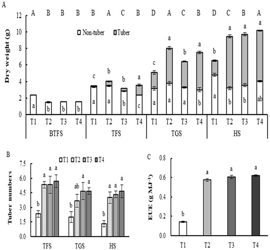 The tuber number of the T1 treatment was lowest in all stages, while at the tuber formation and growth stages, there were no significant differences in the tuber numbers of the T2, T3, and T4 treatments (Figure 1B). The tuber number and dry weight of the plants increased with increasing light intensity or decreasing photoperiod (Figure 1A,B). The dry weight of the non-tuber parts of the plants was highest under the T1 treatment at the BTFS stage but was the opposite under the T4 treatment at the TGS stage. At the TFS stage, the dry weight of the non-tuber parts of the plants under the T1 and T2 treatments was similar and significantly higher than that under the T3 and T4 treatments. The dry weight of the non-tuber parts of the plants of the T1 treatment at the HS stage was significantly higher than that of the T2 and T3 treatments (Figure 1A). At the HS stage, the tuber dry weights of the T2, T3, and T4 treatments exhibited no significant differences and were greater for all three treatments compared to the T1 treatment (Figure 1A). From the TFS to HS stage, the dry matter accumulation of tubers under the T2, T3, and T4 treatments accounted for about 60% of the total dry weight of the plants, whereas it was only 26.23% under the T1 treatment (Figure 1A). The EUE of the T2, T3, and T4 treatments exhibited no significant difference and was greater for all three treatments compared to the T1 treatment (Figure 1C).