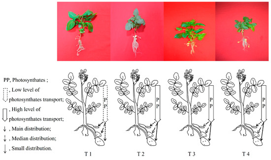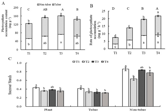 The tuber number per plant in the T2, T3, and T4 treatments slowly increased with the shortening of the photoperiod or the increase in light intensity. Nevertheless, the dry weight of tubers per plant had no significant change under the T2, T3, and T4 treatments, which seemed attributable to the same DLI, while remaining independent of the combinations of photoperiod and light intensity when the light intensity reached the 300 μmol m−2 s−1 level. Previous studies have shown that high light intensity promoted tuber growth under short-day conditions [18,57], suggesting that increasing DLI promotes tuber formation and growth. Although the biosynthetic rate of photosynthate exhibited a significant difference in the T2, T3, and T4 treatments, the photosynthate content per day in the tubers was almost the same, which should directly contribute to the same dry weight of tubers of these three treatments (Figure 1A and Figure 2). In addition, these results suggested that potato plants tried to ensure sufficient carbon supply by accelerating the synthesis rate of photosynthate to acclimate to a shorter photoperiod and higher light intensity; in contrast, plants grown under a longer photoperiod and lower light intensity reduced the synthesis rate of photosynthate to satisfy the total demand of carbon.