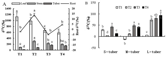 As shown in Figure 3B, 60.44% of δ13C accumulated in the tubers of the potato plants under T1 treatment was distributed in small tubers, while only 12.13% was distributed in large tubers, and δ13C accumulated in the tubers of the potato plants under the T2, T3, and T4 treatments was mainly distributed in large tubers. The δ13C accumulated in small tubers formed by the potato plants under the T2 treatment was significantly higher than that under the other treatments, while the δ13C accumulated in middle tubers formed by potato plants under the T3 and T4 treatments exhibited no significant difference and was significantly higher than that under the T1 and T2 treatments. The δ13C accumulated in large tubers showed a trend of increasing with an increase in light intensity/shortening of the photoperiod.