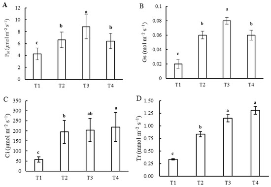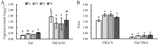 The Car content of the T1 and T3 treatments was significantly less than that of the T4 treatment. Figure 4A,B show that the Chl (a + b) of the T1 treatment was the greatest, and Chl a/b and Car/Chl a were the least, while those of the T2, T3, and T4 treatments exhibited no significant differences.