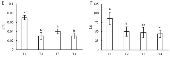 Gas exchange traits, including PN, GS, Ci, and Tr, of the T1 treatment were the least, while the LS and CE were the greatest, and the greatest PN and GS were observed in the T3 treatment. PN and GS exhibited no significant difference under the T2 and T4 treatments, and there was no significant difference in CE under the T2, T3, and T4 treatments. The Tr increased and LS decreased with an increase in light intensity or a decrease in photoperiod (Figure 5A–F).