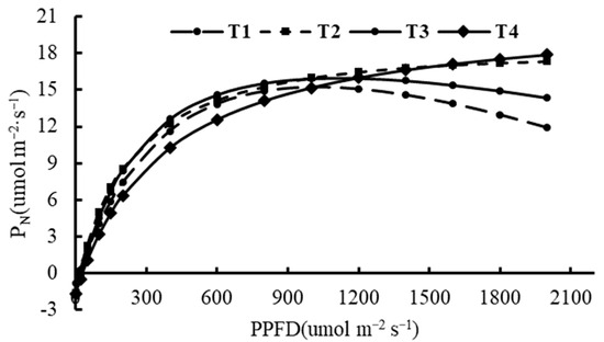 We measured the PN response to the change in PPFD to determine photosynthetic performance. The inflection points of the T1 and T3 treatments occurred earlier than those of the other two treatments, and the PN decreased in the T1 and T3 treatments when the light intensity was about 1200 μmol m−2 s−1 (Figure 6). Correspondingly, the βP was greater and the PNmax was lower in the T1 and T3 treatments compared with the T2 and T4 treatments. The γp and Rd values of the T1 treatment were significantly lower than those of the other treatments, while the γp values of the T3 and T4 treatments were almost the same, and both were significantly less than that of the T2 treatment. The light combinations did not affect the AQY (Table 3).