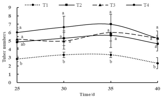 The number of tubers formed during the tuber formation stage determines the number of tubers in the harvest stage. The tuber formation of potato plants under each treatment showed a dynamic trend of first increasing and then decreasing, and tuber formation showed an obvious decreasing trend in the late tuber formation stage (35–40 d). The number of tubers formed by potato plants in the tuber formation stage under the T1 treatment was significantly lower than that under other treatments, and there was no significant difference in the tuber formation number of potato plants under the T2, T3, and T4 treatments. However, numerically, under the same DLI conditions, the number of tubers formed in the tuber formation stage of potato plants increased with the increase in light intensity/shortening of the photoperiod.