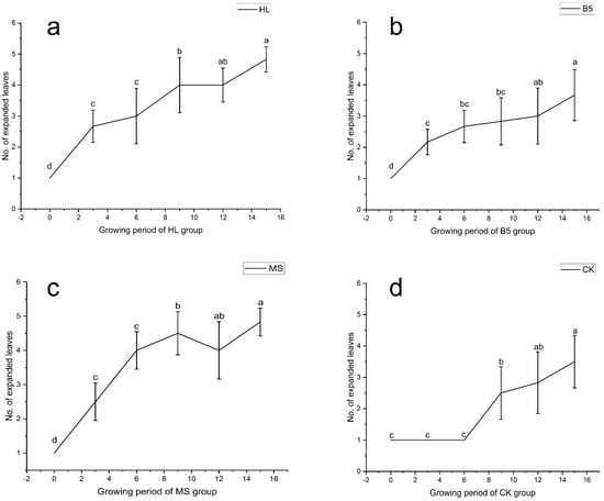 Alfalfa number of fully expanded leaves (unitless count metric) during vegetative growth stage (V1–R1). (a) Hoagland nutrient solution treatment (HL); (b) B5 nutrient solution treatment (B5); (c) Murashige & Skoog (MS) nutrient solution treatment; (d) Reverse osmosis (RO) water control group (CK). Different lowercase letters denote statistically significant differences among treatments (p < 0.05, one-way ANOVA with Duncan’s Multiple Range). Error bars represent standard deviation (n = 5 biological replicates).