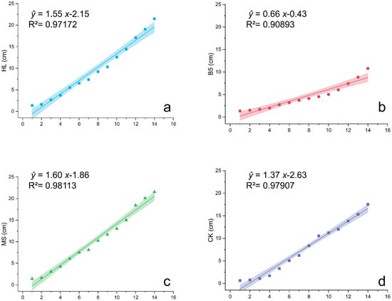 Linear regression of alfalfa plant height under different nutrient treatments. (a) Hoagland nutrient solution treatment (HL); (b) B5 nutrient solution treatment (B5); (c) Murashige & Skoog (MS) medium treatment; (d) Reverse osmosis (RO) water control group (CK). Growth curves fitted via least squares method (solid lines) with 95% confidence intervals (shaded). Regression model: Plant height = Intercept + k × Days. Coefficient comparisons reveal highest growth rates (k) in HL (Hoagland’s solution) and MS (Murashige & Skoog medium), lowest in B5 (Gamborg’s B5). CK: RO water control. All regressions significant (R2 > 0.90, p < 0.001).