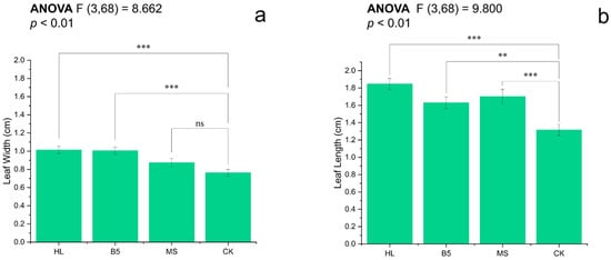 Leaf dimensions of R1-stage alfalfa under nutrient treatments: (a) width; and (b) length. Treatments: HL (Hoagland’s), B5 (Gamborg’s), MS (Murashige-Skoog), and CK (RO water control). Bars show mean ± SEM. Different letters indicate significant differences (Fisher’s LSD, α = 0.05): *** p ≤ 0.001; ** p ≤ 0.01; ns = non-significant. All treatments exceeded CK in both parameters (p < 0.01), except MS leaf width (ns).