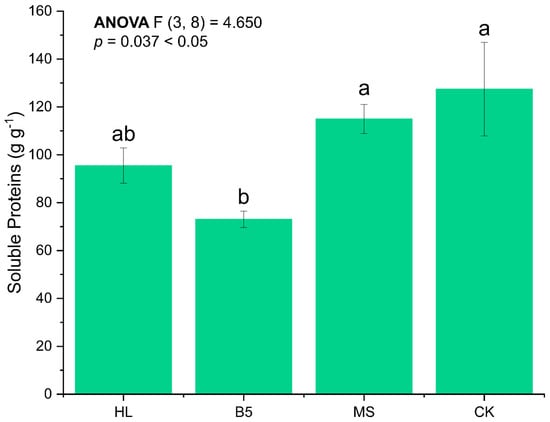 Soluble protein content of leaves of alfalfa after root-drenching with nutrient solution. HL refers to Hoagland’s solution; B5 refers to Gamborg’s B5; MS refers to MS medium; and CK refers to control group which is the RO water group. Error bar refers to standard error of mean. Duncan’s method was chosen for the algorithm of multiple comparisons here. The Latin letters “a, b” indicate the significance level from high to low. The significance level of ANOVA analysis was designated as 0.05.