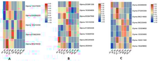 A considerable number of resistance genes in plants have been identified and classified into eight fundamental classes, which can be further divided into various super families based on their functional protein domains. Most of the genes cloned to date belong to the NBS-LRR kinase super families, which provide resistance against a wide range of pathogens, including viruses, bacteria, and pests [24]. In the GO enrichment analysis of the current study, 27 genes related to signal transduction (Table S5) were identified, most of which belong to specific disease-resistant groups and super families, such as Casitas B-lineage lymphoma (CBL)- interacting serine/threonine-protein kinase. Five genes from this family showed deferential expression in both cultivars at different time points. Glyma13G370000, Glyma07G023500 and Glyma08G218400 were upregulated in KF cultivar, while Glyma03G260200 and Glyma18G212200 were upregulated in NN (Figure 6A). Eight genes with predicted disease resistance functions showed expression in the resistant cultivar at almost all three points, except for Glyma19G054900, which was expressed in the susceptible cultivar (Figure 6B). A few genes were also found with predicted functions related to tobacco mosaic virus (TMV) resistance. Another group of eight genes was found in the “Response to auxin” subclass (Table S6). Their differential expression, calculated using FPKM values from RNA-seq data, showed that Glyma04G006300, Glyma07G043500, Glyma09G219900, and Glyma16G011900 were more highly expressed in KF cultivar, while Glyma09G220400, Glyma12G034800, Glyma12G035800, and Glyma19G258800 were more highly expressed in NN cultivar (Figure 6C).