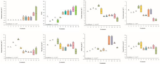 Figure 5 shows the results of the soil chemical analysis. For the Al content in the soil, it was observed that, in relation to the control (T11 and T12) and the other treatments without plants, the presence of peanuts (T1–T6) influenced the reduction of Al in the soil. The same was observed for the H+Al variable.