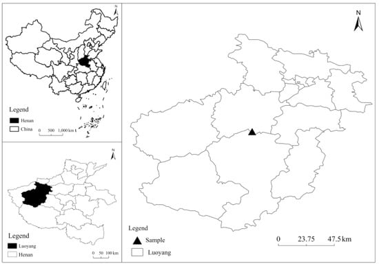 This experiment began in 2010 on the farm of Henan University of Science and Technology (33°35′–35°05′ N, 111°8′–112°59′ E) (Figure 1). The experimental site is located in the temperate zone, belonging to the semi-humid and semi-arid continental monsoon climate. The annual average temperature is 12.1–14.6 °C, the annual average rainfall is about 600 mm, the annual average evaporation is about 2114 mm, the annual sunshine hours are 2300–2600 h, the frost-free period is 215–219 days, and the annual average radiation is about 492 kJ cm−2. The soil is calcareous, with 36% clay, 20% fine sand, and 44% silt. At the beginning of the experiment in 2010, the 0–20 cm topsoil contained 10.72 g kg−1 of organic matter, 79.86 mg kg−1 of alkali hydrolyzed nitrogen, 11.62 mg kg−1 of available phosphorus, 223.8 mg kg−1 of available potassium, and a soil pH of 7.56.