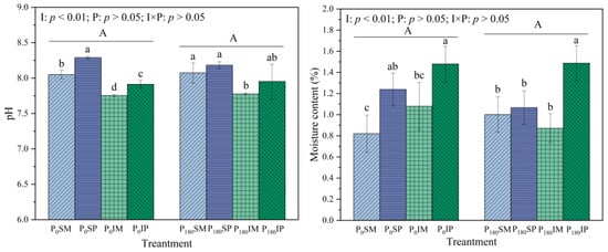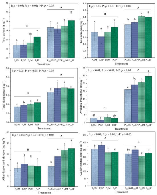Effects of intercropping and phosphate fertilizer application on physicochemical properties of rhizosphere soil. I: planting pattern; P: phosphorus level; I × P: planting pattern×phosphorus level. Different lowercase letters indicate significant differences between different treatments under the same P level (p < 0.05), and different uppercase letters indicate significant differences between two P levels (p < 0.05).
