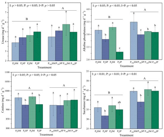 Effects of intercropping and phosphate fertilizer application on enzyme activity of rhizosphere soil. Different lowercase letters indicate significant differences between different treatments under the same P level (p < 0.05), and different uppercase letters indicate significant differences between two P levels (p < 0.05).