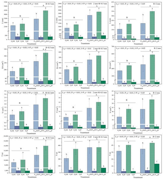 Effects of intercropping and phosphate fertilizer application on root morphological characteristics. L: root length; SA: root surface area; V: root volume; T: root tip number; R: root diameter. Different lowercase letters indicate significant differences between different treatments under the same P level (p < 0.05), and different uppercase letters indicate significant differences between two P levels (p < 0.05).