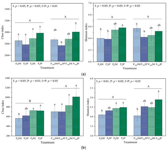 Effects of intercropping and phosphorus fertilizer application on Chao and Shannon indices of bacteria (a) and fungi (b) in rhizosphere soil. Different lowercase letters indicate significant differences between different treatments under the same P level (p < 0.05), and different uppercase letters indicate significant differences between two P levels (p < 0.05).