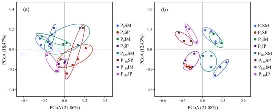 PCoA of soil bacterial (a) and fungi (b) community structures under different treatments.