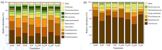 The composition of rhizosphere soil microbial communities under different treatments is shown in Figure 8. The dominant bacterial communities at the phylum level were Pseudomonadota (relative abundance of 23.99%), Acidobacteriota (relative abundance of 22.51%), Actinobacteriota (relative abundance of 17.19%), Chloroflexi (relative abundance of 7.88%), Bacteroidota (relative abundance of 4.86%), Gemmatimonadota (relative abundance of 4.72%), Myxococcota (relative abundance of 3.89%), Verrucomicrobiota (relative abundance of 2.48%), and Firmicutes (relative abundance of 1.72%) (Figure 8a). The fungal community was dominated by Ascomycota, with a relative abundance of 60.55%, followed by Basidiomycota (15.46%), Mortierellomycota (8.69%), Chytridiomycot (4.70%), and Glomeromycota (2.34%) (Figure 8b).