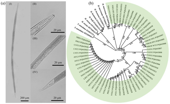 Identification and classification of Hirschmanniella mucronata in this study: (a) morphological characteristics of representative H. mucronata female: (I) whole body, (II) anterior region, (III) middle region and (IV) tail; (b) maximum-likelihood-based phylogenetic tree constructed from ITS nucleotide sequences of 57 obtained samples (green colour), H. mucronata, H. oryzae, H. loofi and H. kwazuna. ITS sequence of Tylenchorhynchus annulatus used as outer group. Numbers beside branches represent ML bootstrap support values ≥ 90%.
