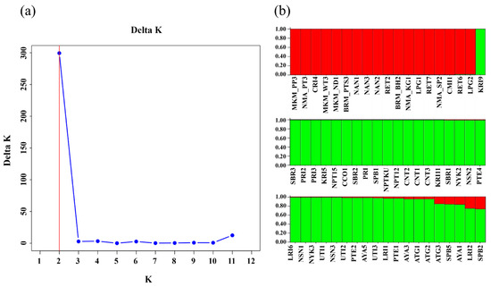 - Pritchard, J.K.; Stephens, M.; Donnelly, P. Inference of population structure using multilocus genotype data. Genetics 2000, 155, 945–959. [Google Scholar] [CrossRef]