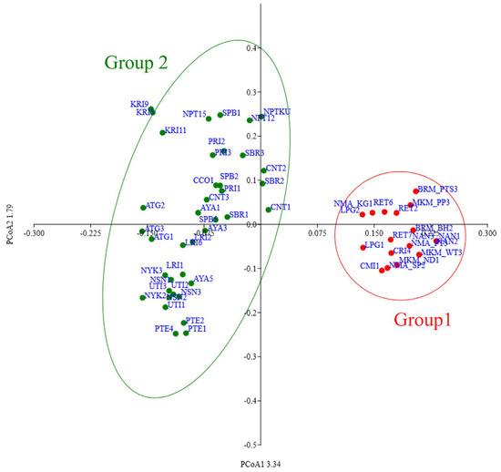 The population structure of the 57 nematode populations was analysed and had a peak of ∆k = 300 at k = 2, suggesting the presence of two sub-populations (Group 1 and Group 2; Figure 2a,b). Likewise, the PCoA based on Jaccard dissimilarity index revealed two distinct groups (Figure 3). Group 1 comprised 18 populations, predominantly from the northern (7 populations) and northeastern (11 populations) regions of Thailand, whereas Group 2 comprised 39 populations, all from the central rice-growing region.