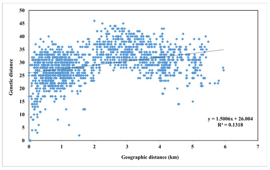 Based on the results of the AMOVA, 76% of the molecular variation occurred within groups, while 22% originated from differences among groups. The ϕPT value, which explain the variations between the two groups, was 0.24 (p = 0.001), suggesting high genetic similarity between the populations. Furthermore, the number of migrants (Nm), indicating the level of gene flow among the H. mucronata populations in Thailand, was 0.80 (Table 4), supporting the previous finding of high similarity between the two groups. There was no obvious correlation between genetic distance and geographic distance between the two groups (Mentel test, R2 = 0.1318, Figure 4). Notably, the Nm value between the north and the northeast regions was 1.12 (Table 4), suggesting a high gene flow between the two regions, which may have contributed to the genetic similarity among the populations within Group 1.