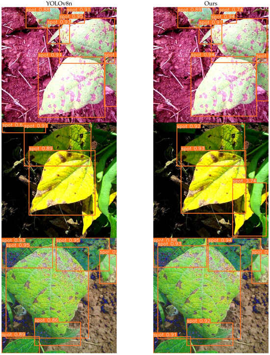 Figure 13 presents a qualitative comparison between the baseline model (YOLOv8n) and our proposed method on leaf disease detection tasks. It is evident that our model achieves more precise lesion localization and better robustness under natural environmental conditions. In the first row, the baseline model exhibits multiple overlapping bounding boxes for a single lesion area, leading to redundant detection results. In contrast, our model produces more concise and spatially accurate boxes, effectively outlining the true extent of each lesion. The second and third rows highlight our model’s improved ability to suppress background noise and irrelevant textures. While YOLOv8n occasionally misidentifies leaf textures or lighting artifacts as diseased regions, our method demonstrates more consistent focus on actual lesion areas. In the final row, both models correctly detect the healthy leaves. However, our model shows a cleaner output, avoiding unnecessary markings in non-infected regions or backgrounds.