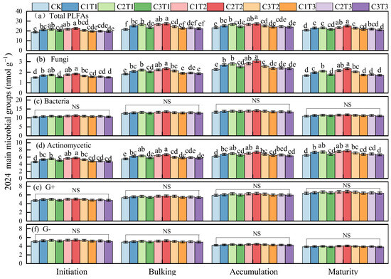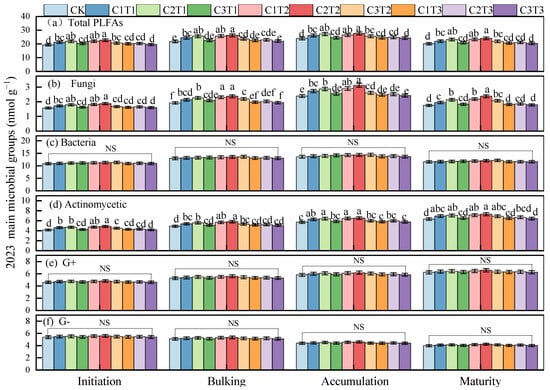 Changes in total soil phospholipid fatty acids (a), fungi (b), bacteria (c), actinomycetes (d), Gram-positive bacteria (G+) (e), and Gram-negative bacteria (G−) (f) during the tuber formation, tuber bulking, starch accumulation, and maturity stages of potato farmland under different biochar treatments in 2023. NS indicates no significant difference. Different letters indicate significant differences between treatments (p < 0.05). Values are means ± standard errors (n = 3).