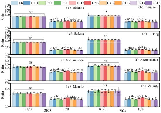 Changes in soil G+/G− and F/B ratios in potato farmland under different biochar conditions during the tuber formation stage, tuber bulking stage, starch accumulation stage, and maturation stage in 2023 (a,c,e,g) and 2024 (b,d,f,h). G+/G− and F/B represent the ratio of Gram-positive to Gram-negative bacteria and the ratio of fungi to bacteria, respectively. The same procedure was followed as described above.