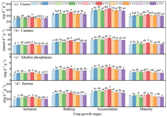 Urease, alkaline phosphatase, and sucrase play crucial roles in the soil nitrogen, phosphorus, and carbon cycles, respectively, influencing soil nitrogen supply intensity, plant-available phosphorus content, and the bioavailability of soil organic matter [12]. Catalase activity reflects soil oxidation intensity and is closely associated with soil organic matter and microbial activity [15]. Adding biochar to the soil not only serves as an energy source for microbial activity but also offers abundant substrates for enzymatic reactions [51].