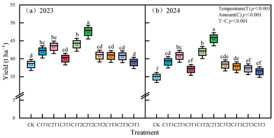 Effect of different biochar treatments on potato yield in 2023 (a) and 2024 (b). The same procedure was followed as described above.