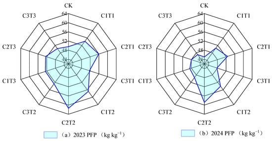 where Y represents the yield (kg ha−1); PFP is the fertilizer partial productivity (kg kg−1); and FT is the total amount of N, P2O5, and K2O applied (kg ha−1).