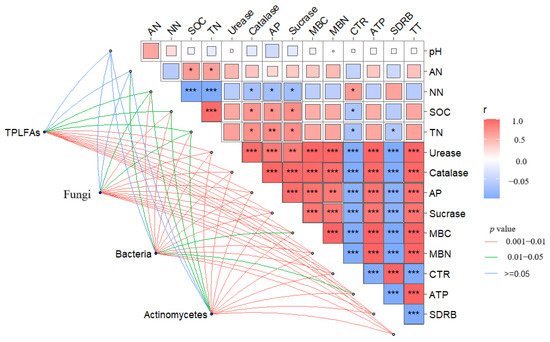 The relationship between microbial community and soil environmental factors under different biochar conditions in 2023–2024. AN represents ammonium nitrogen; NN represents nitrate nitrogen; SOC represents organic carbon; TN represents total nitrogen; and AP represents alkaline phosphatase. * p < 0.05, ** p < 0.01, *** p < 0.001. The same procedure was followed as described above.
