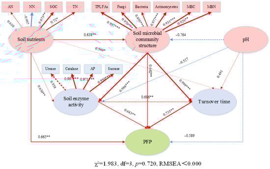 Direct and indirect effects of biochar on soil pH, nutrients, enzyme activity, microbial community structure, and soil microbial regeneration cycle on soil nutrient use efficiency (PFP) in 2023 and 2024. The numbers beside the arrows indicate path coefficients, with arrow width reflecting the magnitude of these coefficients. Red arrows denote positive correlations, while blue arrows indicate negative correlations. Solid arrows represent significant relationships, and dashed arrows represent non-significant ones. * p < 0.05, ** p < 0.01, *** p < 0.001. The same procedure was followed as described above.