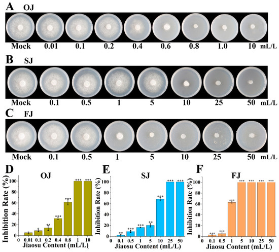 Anti-oomycete effect of PJ on P. infestans and localization of anti-oomycete substances in PJ. (A–C) Growth of P. infestans on OJ, SJ, and FJ; (D–F) inhibition rate of OJ, SJ, and FJ (t-test: * p < 0.05; ** p < 0.01; *** p < 0.001); OJ: original jiaosu; SJ: sterilized jiaosu; FJ: filtered jiaosu.
