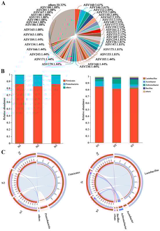 Bacterial community composition in plant jiaosu (PJ). (A) The abundance of each ASV in the PJ; (B) the composition and proportions of different microorganisms within the PJ at both the phylum and genus levels; (C) the relationship between samples and species and the major dominant microorganisms in the PJ at the phylum and genus levels. (Note: N represents PJ.)