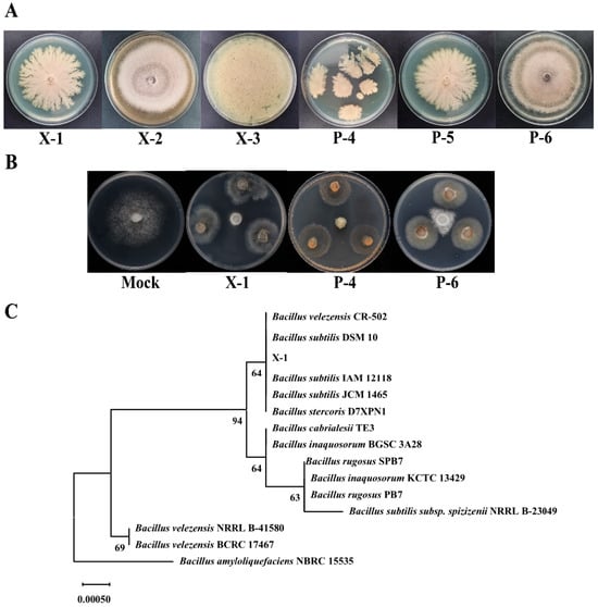 The isolation, purification, screening, and identification of anti-oomycete strains in the plant jiaosu (PJ). (A) The isolation and purification of microorganisms; (B) the anti-oomycete activity of X-1, P-4, and P-6 in P. infestans; (C) the phylogenetic tree of the strain X-1 with the strains downloaded from NCBI. (The tree is drawn to scale, with branch lengths in the same units as those of the evolutionary distances used to produce the phylogenetic tree. The evolutionary distances were computed using the p-distance method.)