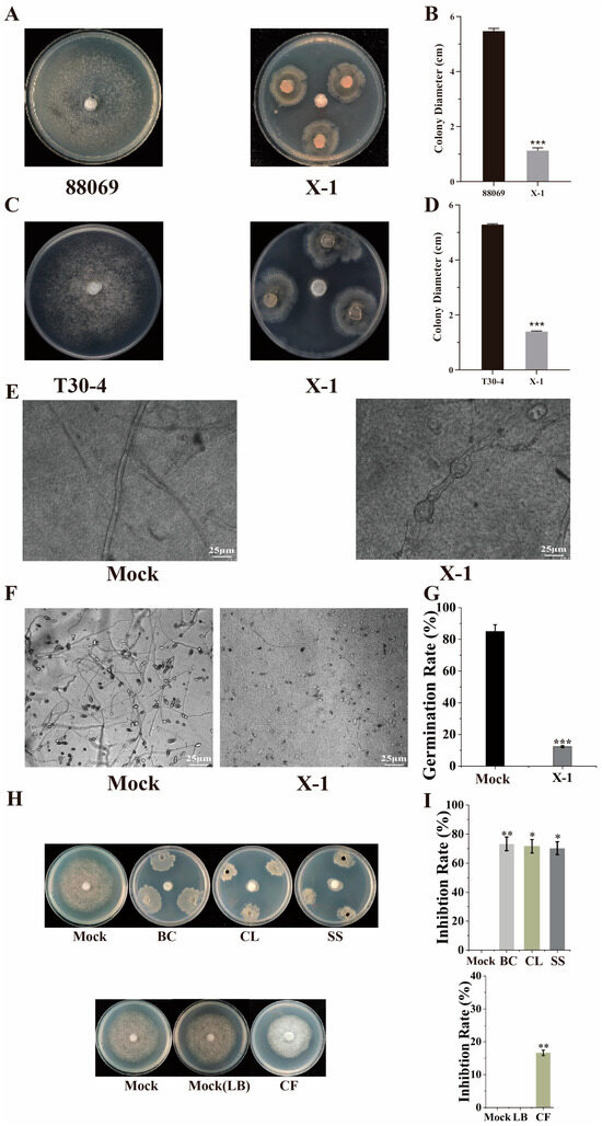 Effect of B. subtilis X-1 on P. infestans mycelial growth and sporangia germination. (A,B) Colony morphology and diameter of strain T30-4 under X-1 confrontation; (C,D) colony morphology and diameter of strain 88069 under X-1 confrontation; (E) hyphal phenotype of T30-4 treated with X-1 under microscope; (F,G) sporangia germination and inhibition rate of P. infestans with or without X-1 treatment; (H,I) colony diameter and inhibition rate of strain T30-4 treated with X-1 after different treatments. BC: bacterial culture; CL: cell lysate; SS: sterile water cell suspension; CF: cell-free supernatant (t-test: * p < 0.05; ** p < 0.01; *** p < 0.001).
