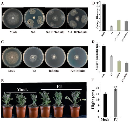 Application potential of X-1 and plant jiaosu (PJ). (A,B) Growth and colony diameter of P. infestans under treatment with X-1 and Infinito; (C,D) growth and colony diameter of P. infestans after PJ and Infinito treatments; (E,F) growth status and height of potato plants with PJ treatment (t-test: * p < 0.05; ** p < 0.01).
