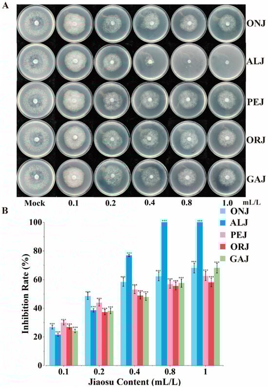 Inhibition of Phytophthora infestans by plant jiaosu (PJ) derived from fruit and vegetable waste. (A) Growth of P. infestans on plates with different PJ (ONJ: PJ derived from onion peels; ALJ: PJ derived from asparagus lettuce leaves; PEJ: PJ derived from pepper segments; ORJ: PJ derived from orange peels; GAJ: PJ derived from garlic peels); (B) inhibition rate of different forms of PJ (ONJ, ALJ, PEJ, ORJ, GAJ) (t-test: *** p < 0.001).