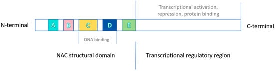 The NAC domain, highly conserved and specific to the N-terminal end of NAC proteins, is the most important structural feature. It is capable of recognizing and binding to specific cis-binding elements. The NAC domain can be subdivided into five sub-domains, namely A, B, C, D and E. Among them, the A, C and D sub-domains are highly conserved across different species and carry a positive charge. Notably, the C and D subdomains facilitate protein binding to DNA, and carry a positive charge. The B and E sub-domains exhibit species-dependent variations, which may correlate with the functional diversity of the NAC family. In contrast, the C-terminal is a multifunctional regulatory domain with relatively simple sequences, often consisting of repetitive amino acid sequences [47,48,49] (Figure 1).