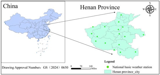 The meteorological element station observation data set of Henan Province includes the daily observation data of temperature, precipitation, relative humidity, wind speed, and sunshine hours of 18 national basic meteorological stations in Henan Province. The temperature includes average temperature, daily maximum temperature, and daily minimum temperature. Relative humidity includes average relative humidity and minimum relative humidity. The precipitation includes 20–8 o’clock precipitation (night), 8–20 o’clock precipitation (daytime), and 20–20 o’clock cumulative precipitation. Wind direction and wind speed include an average of 2 min wind speed, an average of 10 min wind speed, maximum wind speed, and maximum wind direction. Sunshine hours include sunshine hours and total solar radiation (calculated based on sunshine hours). The data set is from the National Meteorological Information Center of China Meteorological Administration (http://data.cma.cn, accessed on 20 July 2024). The statistical methods used in the development generally follow the national standard GB/T 34412-2017 [58]. The data used in this study are distributed in various prefecture-level cities in Henan Province from 1 January 2000 to 31 December 2023. The data format is CSV format, of which 32766 and 99999X represent data missing or no observation tasks. The key parameters, such as precipitation (mm), relative humidity (%), wind speed (m/s), maximum wind speed (m/s), average temperature (°C), maximum temperature (°C), minimum temperature (°C), and sunshine time, were selected in this study. This study uses data from 10 meteorological stations in five regions of Henan (Table S1). Two meteorological stations are selected in each region to represent two prefecture-level cities. Sites with missing data and no observation tasks should be replaced with adjacent site data in prefecture-level cities. Five adjacent national-level ground general meteorological observation stations with missing data were selected, and the inverse distance weighting method was used for interpolation to obtain missing data.