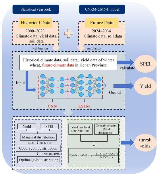 The premise of quantifying the drought threshold is to predict winter wheat yield under future climate change accurately [38]. Existing approaches in drought-yield modeling rely heavily on manual field surveys, which are labor-intensive and limited in scale. For example, crop growth models such as DSSAT, APSIM, WOFOST, and PCSE, which depend on extensive crop growth data [39], can accurately simulate crop growth and interactions between climate and soil factors at the field scale. These models provide valuable guidance for production management and risk assessments. However, their application at larger scales is constrained by the spatial heterogeneity of soil properties, climate factors, crop parameters, and field management strategies, making large-scale deployment challenging [40,41]. Deep learning models are the most effective techniques compared to existing drought-yield modeling techniques and have been widely used in climate change analysis, land use and land cover change detection, and drought monitoring [42]. For example, recurrent neural network (RNN) [43], convolutional neural network (CNN) [44], and long short-term memory (LSTM) [45]. CNN can deeply identify the features of time series data and compress the features to improve the generalization ability and learning efficiency of the model. RNN has been used for yield prediction, but it is not enough to deal with long-interval time series data [46], while the LSTM model has long-term memory ability for time series prediction. Therefore, scholars have combined CNN and LSTM to extract spatio-temporal features in input data more effectively. The coupling model has been widely used, for example, the CNN-LSTM-SA model proposed by Pan et al. [47], which accurately mines the internal correlation in oil healthy production data; Zha et al. [48] used a combined CNN-LSTM model to predict gas field production effectively; Agga et al. [49] predicted short-term photovoltaic power generation using CNN-LSTM; Saini et al. [50] used this coupling model to predict sugarcane yield. These results show that the prediction accuracy of the CNN-LSTM combined model is better than that of the independent LSTM and CNN models. However, the idea of combining the model with the climate model [51,52] to simulate different climates in the future is novel. This study combines CNN-LSTM with Copula theory to accurately calculate the probability of drought occurrence in large-scale regions. This study will improve the accuracy of quantifying future drought thresholds through conditional probability. As one of the newer theories, the Copula conditional probability framework [53,54,55,56] helps capture multivariate characteristics in the meteorological field, especially in the nonlinear relationship between different random variables [57]. This method significantly improves the limitations of traditional techniques in representing nonlinear processes and adds a threshold to the drought index to distinguish the level of drought severity. The hybrid model, which is constructed by integrating the two elements of CNN and LSTM, can handle the complex process of drought occurrence. This method comprehensively solves most of the inherent problems in the process of drought occurrence, can accurately predict the probability of drought occurrence, and quantitatively analyzes various influencing factors.