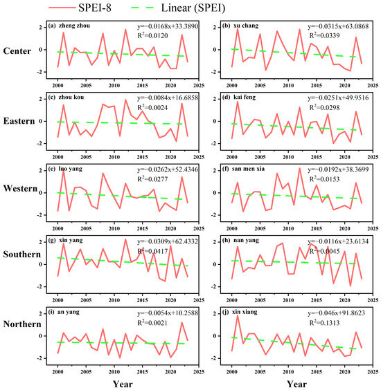 Trend analysis of the SPEI time series. (a,b) Show the change in SPEI8 in the Center, (c,d) Show the change in SPEI8 in the Easter, (e,f) Show the change in SPEI8 in the Western, (g,h) Show the change in SPEI8 in the Southern, (i,j) Show the change in SPEI8 in the Northern. Each subgraph in the figure represents a region. The red solid line represents the change in SPEI8 during the growth period of winter wheat from 2000 to 2023, and the green dotted line represents the linear trend of SPEI8. The abscissa represents the year, and the ordinate represents the value of SPEI8.