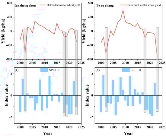 Comparing the detrended time series in central Henan with SPEI over the same period. (a,b) Show yield change in winter wheat growth period, (c,d) Show SPEI8 value. This gray column indicates that winter wheat yield has a significant downward trend in severe drought years.